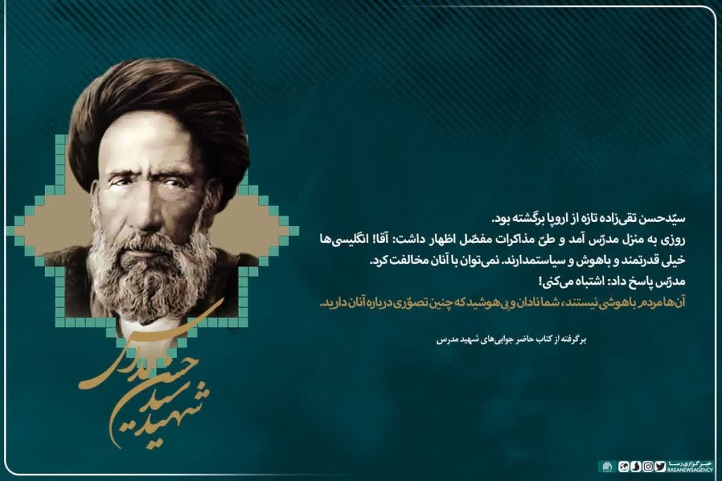 «به رضاخان بگو که سیدحسن مدرس، وظیفه شرعی دارد که در امور مسلمین دخالت کند. اسم آن را سیاست بگذارید یا چیز دیگر، هر چه باشد، فرقی نمیکند. من وظیفه خود را انجام میدهم. سیاست در اسلام چیزی جدا از دین نیست. در اسلام دین سیاست باهم است. اسلام، مسیحیت نیست که فقط جنبه تشریفاتی، آن هم هفتهای یک روز در کلیسا داشته باشد. این پولها را هم ببر که اگر اینجا بماند، تمامی آن به مصرف نابودی رضاخان خواهد رسید.»